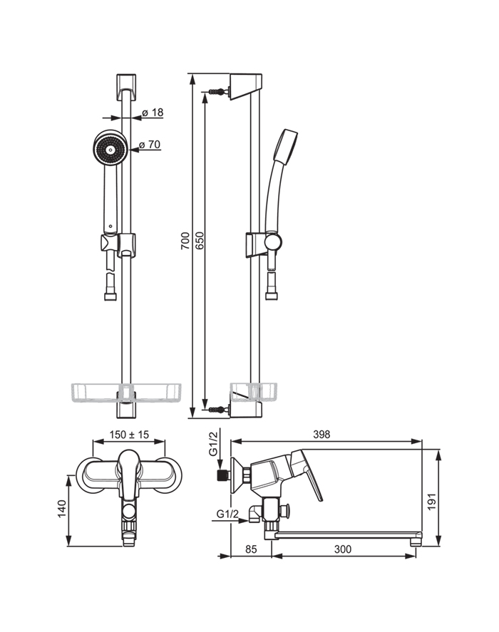 В комплекте: душевая стойка с держателем душевой лейки, высота: 70 см, диаметр: 18 см.