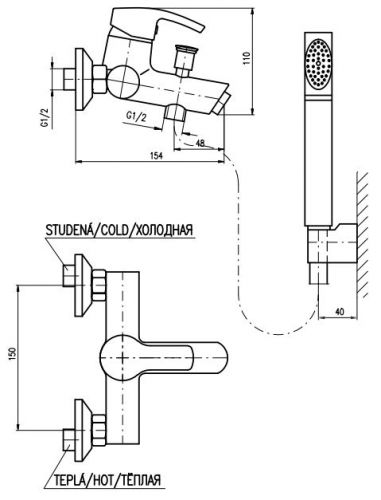 Rav Slezak Rio R154.5/1 смеситель для ванны. С душем в комплекте. Установка на стену. Стабильный держатель.