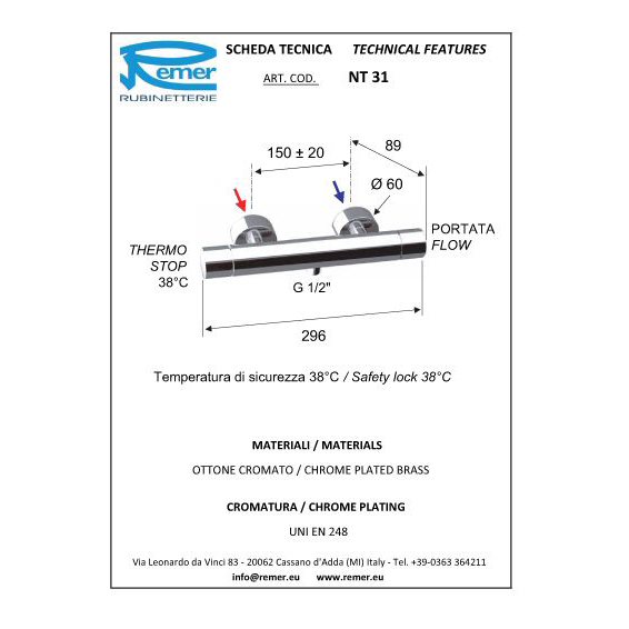 Смеситель для ванны Remer Minimal Thermo NT31 с термостатом.