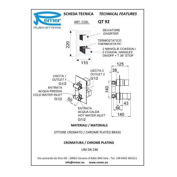 Смеситель для ванны Remer Qubica Thermo QT92 с термостатом.