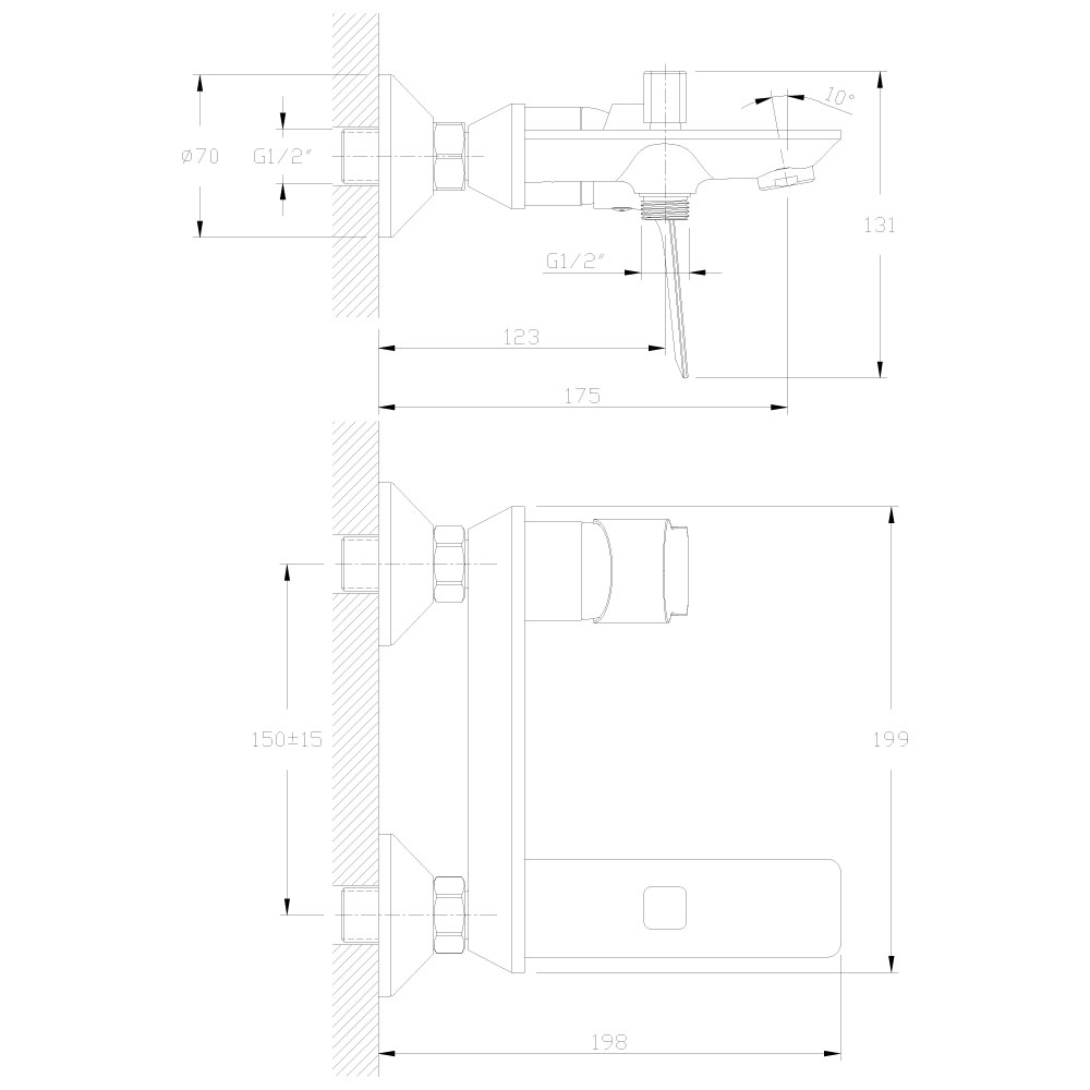 Смеситель для ванны Rossnika RS28-31 с монолитным изливом. Пластиковый аэратор с функцией легкой очистки, керамический картридж 35 мм, кнопочный переключатель, аксессуары в комплекте (шланг 1,5 м, настенное крепление, 5-функциональная лейка с функцией легкой очистки), присоединительная группа (эксцентрики с отражателями) для вертикального крепления, металлическая рукоятка