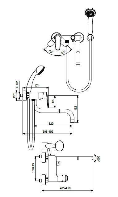 - душевой гарнитур (лейка, шланг, настенный держатель).