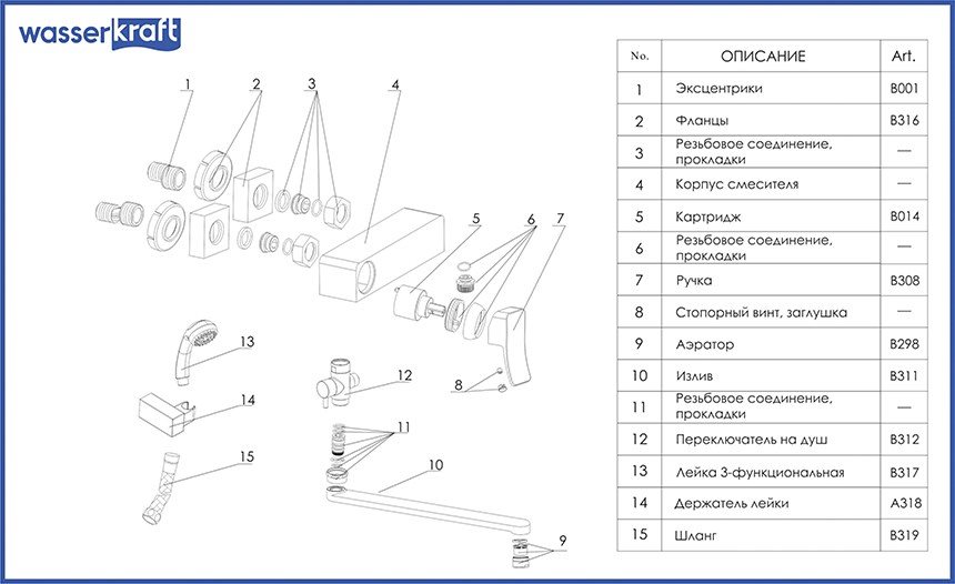 Смеситель для ванны и душа Wasser Kraft Exter 1602L с длинным поворотным изливом.
