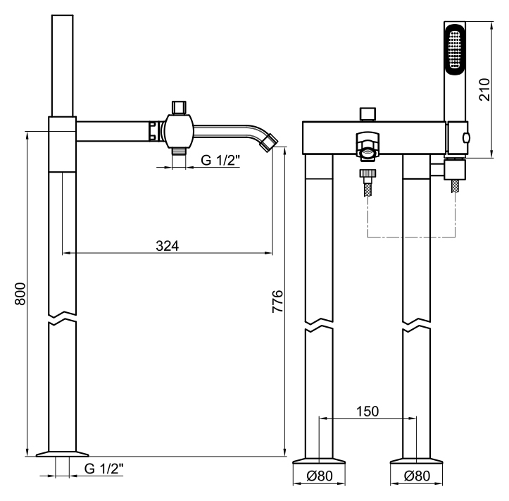 Смеситель для ванны Webert Azeta AZ850401015 однорычажный, с длинным изливом, устанавливаемый в два отверстия, в комплекте с двумя напольными колоннами и душевым гарнитуром.