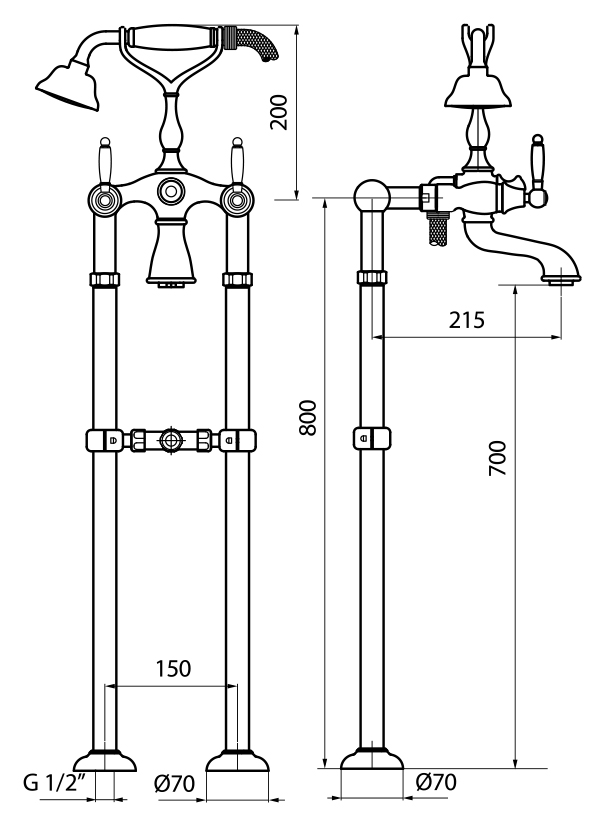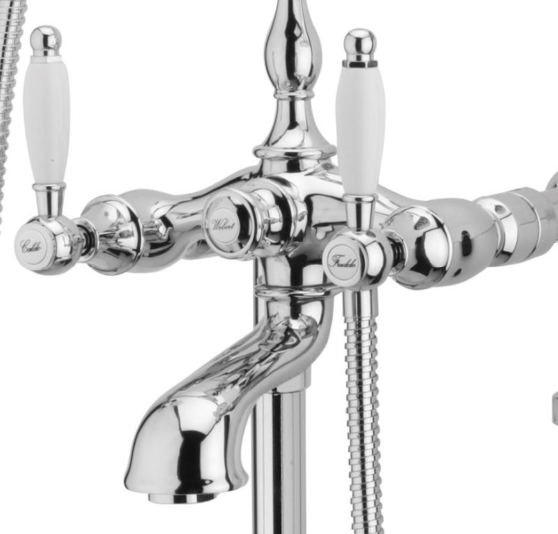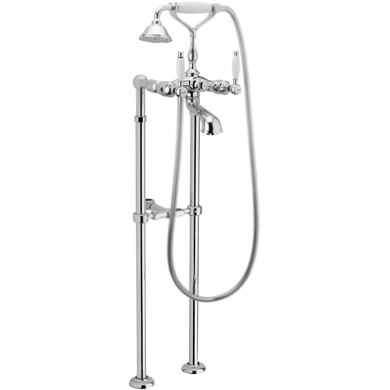 Смеситель для ванны Webert Dorian DO720801015 двухвентильный, с ручками стилизованными под керамику, в комплекте с двумя напольными колоннами и душевым гарнитуром.