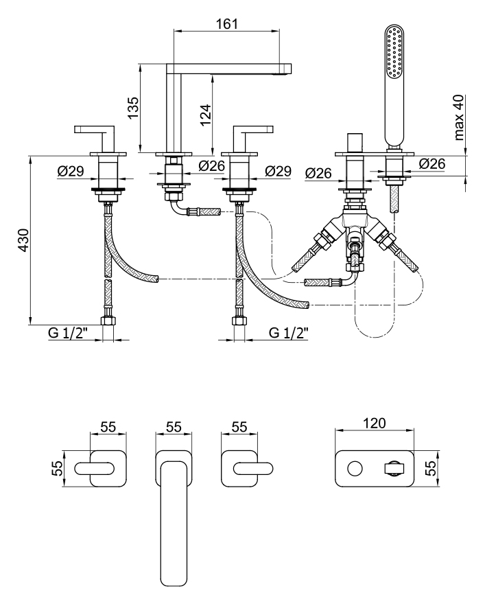 Смеситель на борт ванны Webert Living LV730401560 в комплекте с внутренней частью, двухвентильный, устанавливаемый в пять отверстий, в комплекте с душевым гарнитуром.