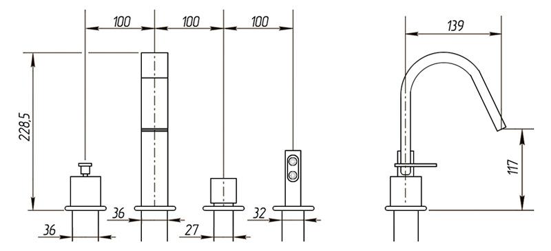 - Душевой гарнитур: компактный ручной душ, шланг, держатель.