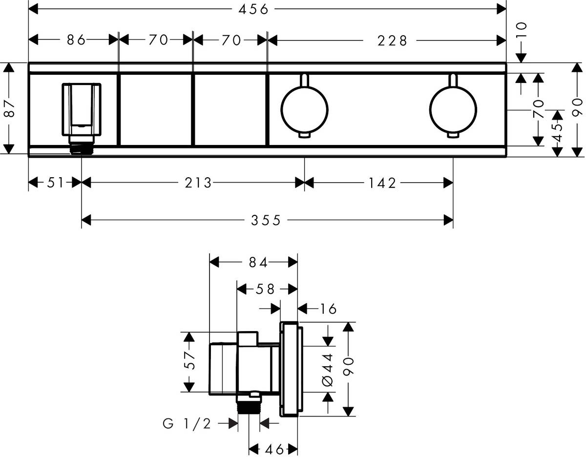 - Термостат поставляется с кнопками ручной душ и Rain large.