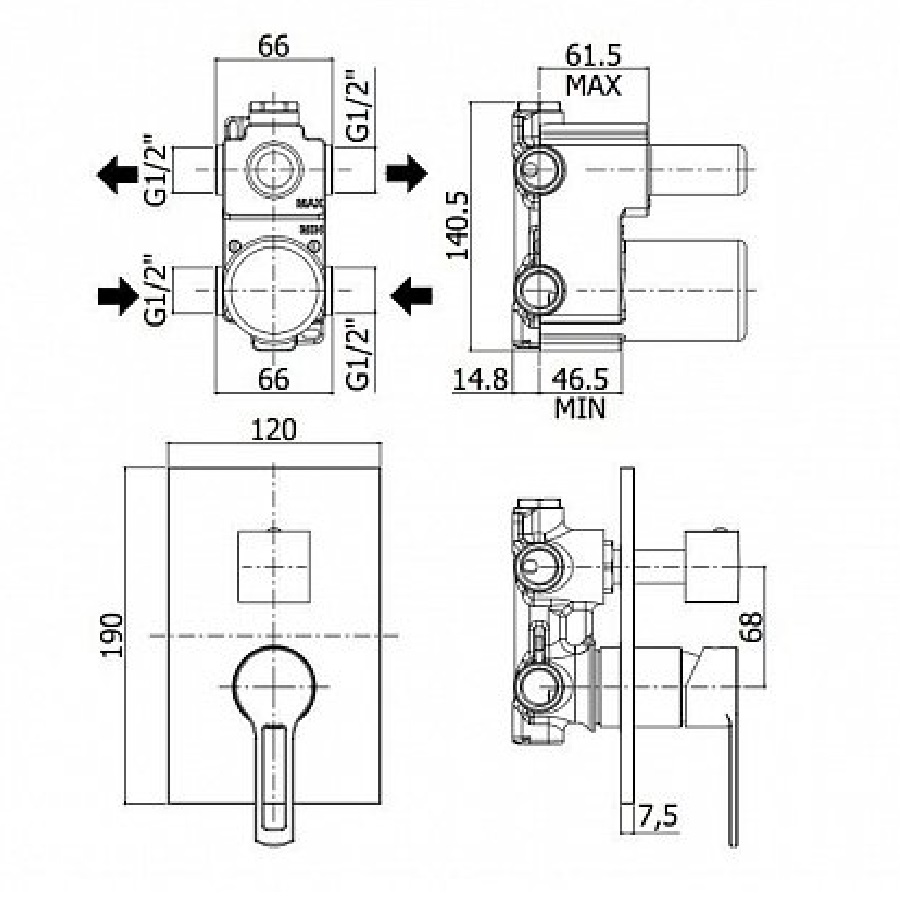 - Смеситель на 2 выхода с накладкой из нержавеющей стали, 2 положения + 1 комбо,