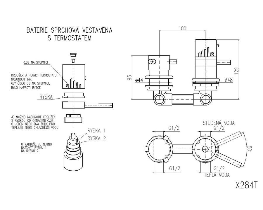 Встраиваемый термостат для душа Rav Slezak X284T, однорычажный, с переключателем на 2 позиции. Качественный термостатический картридж 40 мм. Подвод воды G1/2. В комплекте внешняя и внутренняя части смесителя и комплект крепления.