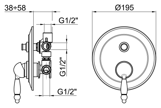 Настенный смеситель для ванны Webert Dorian DO860101015 однорычажный, встраиваемый, на одно отверстие, в комплекте с внутренней частью, с ручкой стилизованной под керамику.