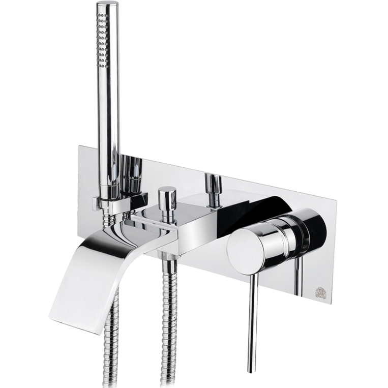 - Душевой гарнитур: ручной душ, металлический шланг, встроенный держатель.