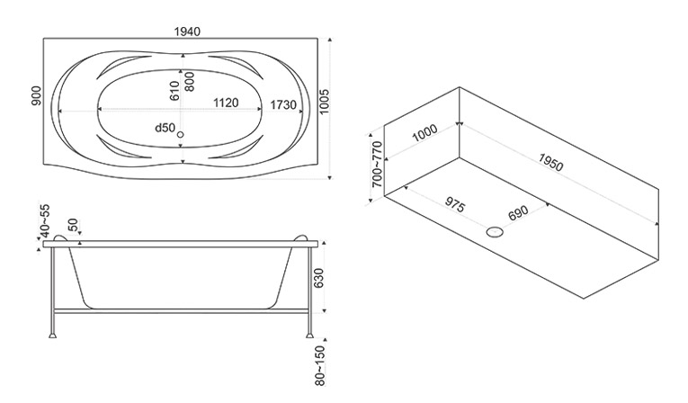 В комплекте поставки: чаша ванны, каркас, слив-перелив.