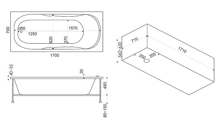 - Ванна изготовлена из литьевого акрила толщиной 5 мм с усиленным армирующим слоем из стеклоровинга и полиэфирной смолы по всей внутренней поверхности, цвет - белый.