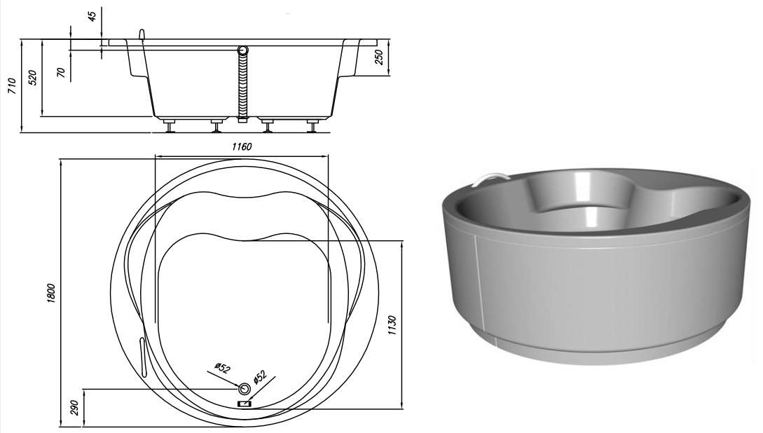 Ванна из литого акрила, армированная. Отличается прочностью и имеет гладкую поверхность без пор, что препятствует размножению бактерий и облегчает уход за ванной.
