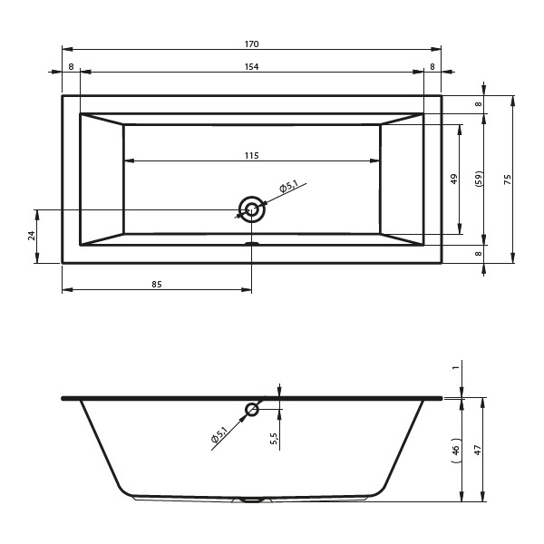 Габариты: 170x75 см. Глубина: 47 см. Объем: 250 л.