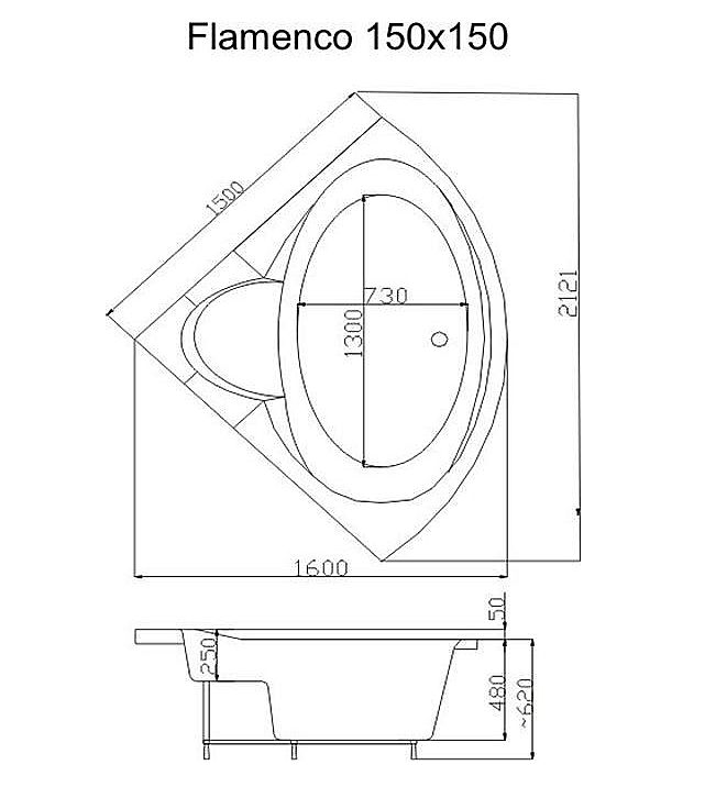Victory Spa Flamenco 150 угловая акриловая ванна белого цвета. Ванна без системы управления. Дополнительно можно приобрести панели, алюминиевую раму, подводную подсветку, отделку форсунок хром.