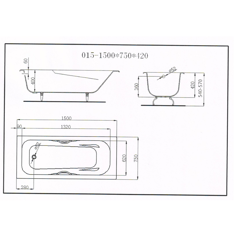 - габариты ванны (ДШВ): 150x75x57. Глубина чаши: 42 см