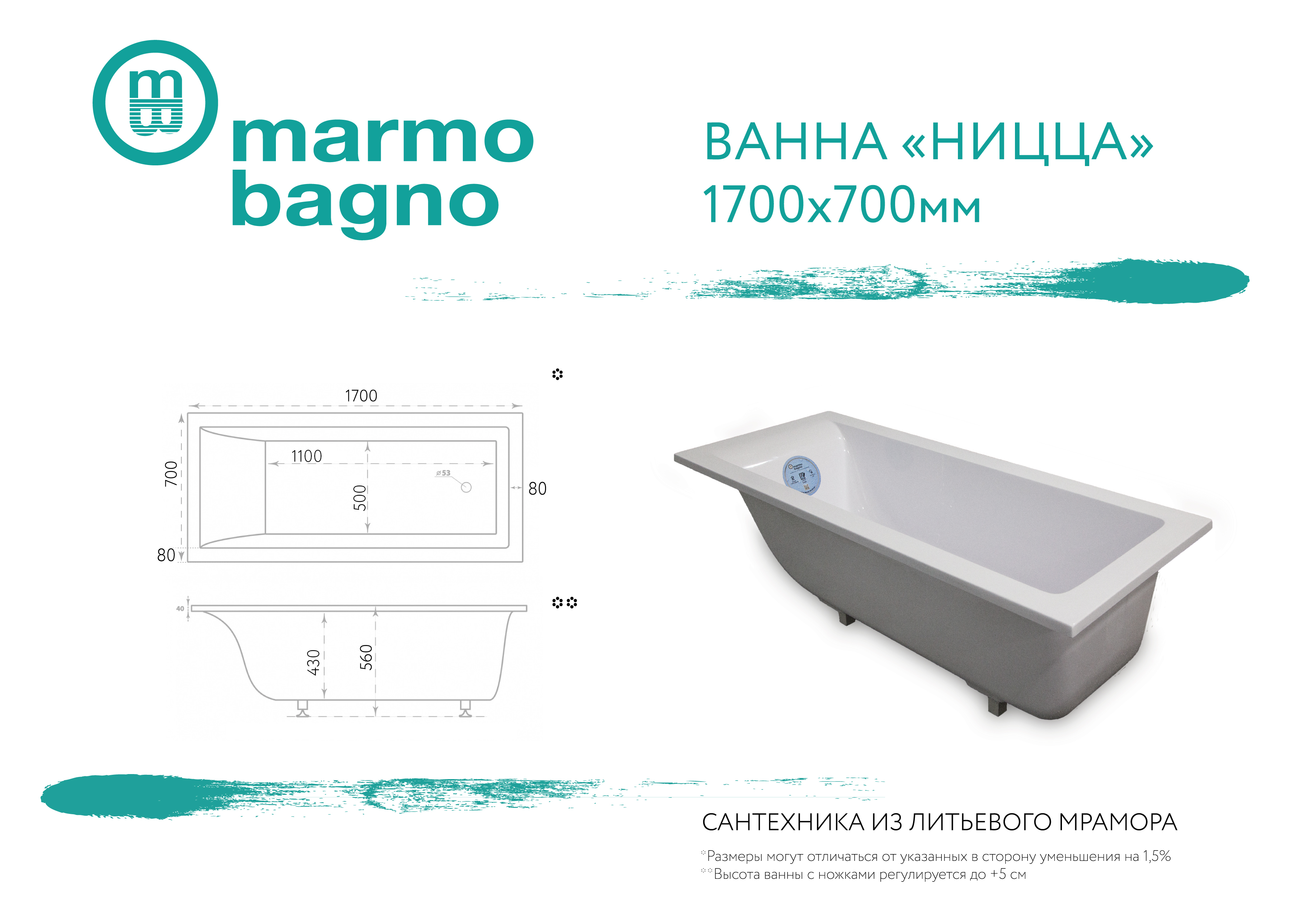 Ванна из литьевого мрамора Marmo Bagno Ницца 170x70 MB-N170-70 с ножками без гидромассажа