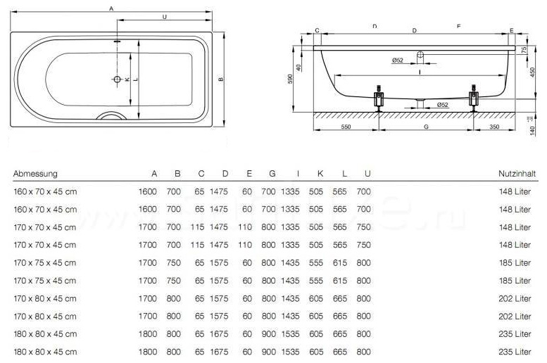 Стальная ванна Bette Ocean 8854 с шумоизоляцией, перелив сзади.