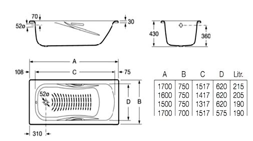 - Габариты: Длина 1700 мм, Ширина 750 мм, Высота 415 мм.